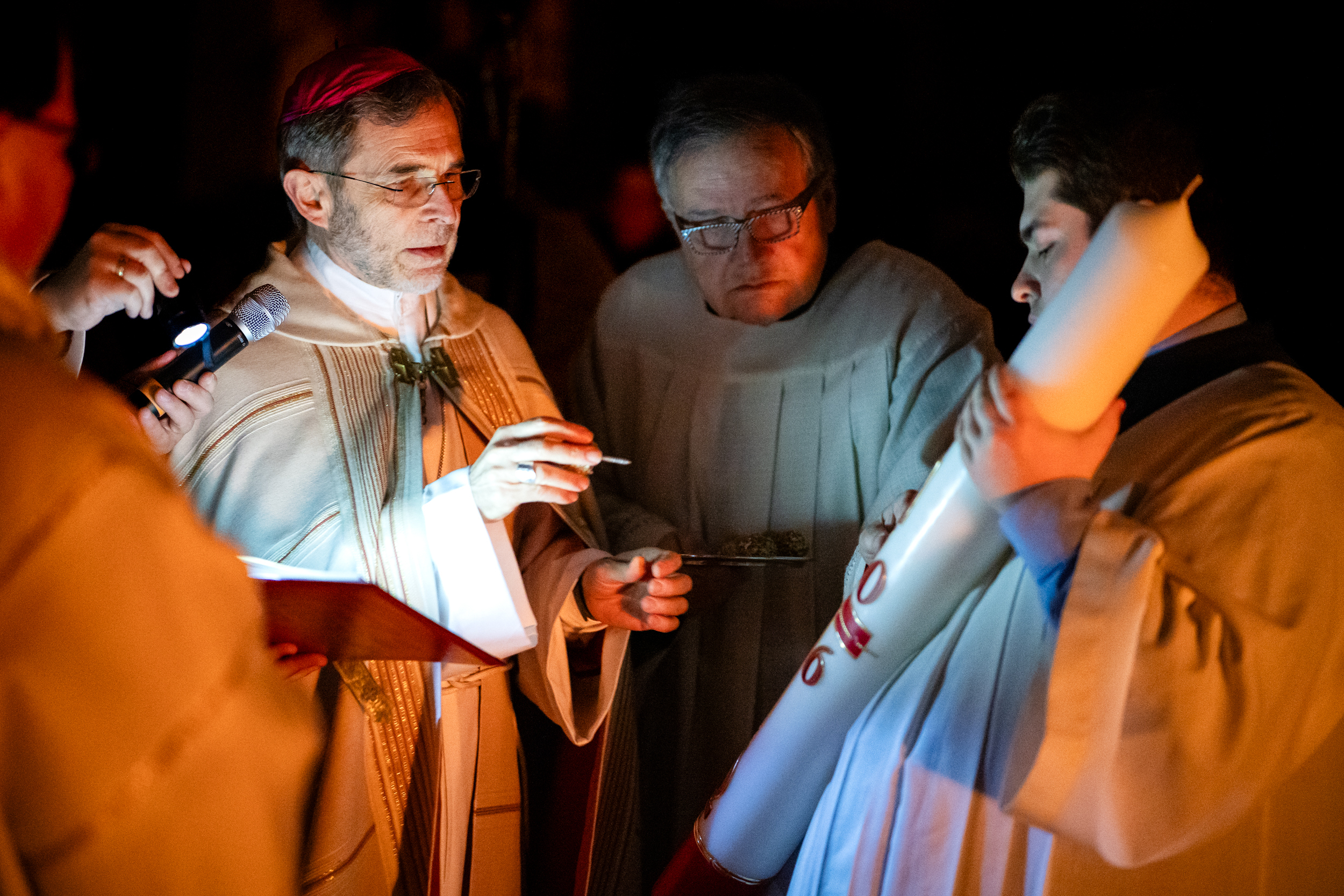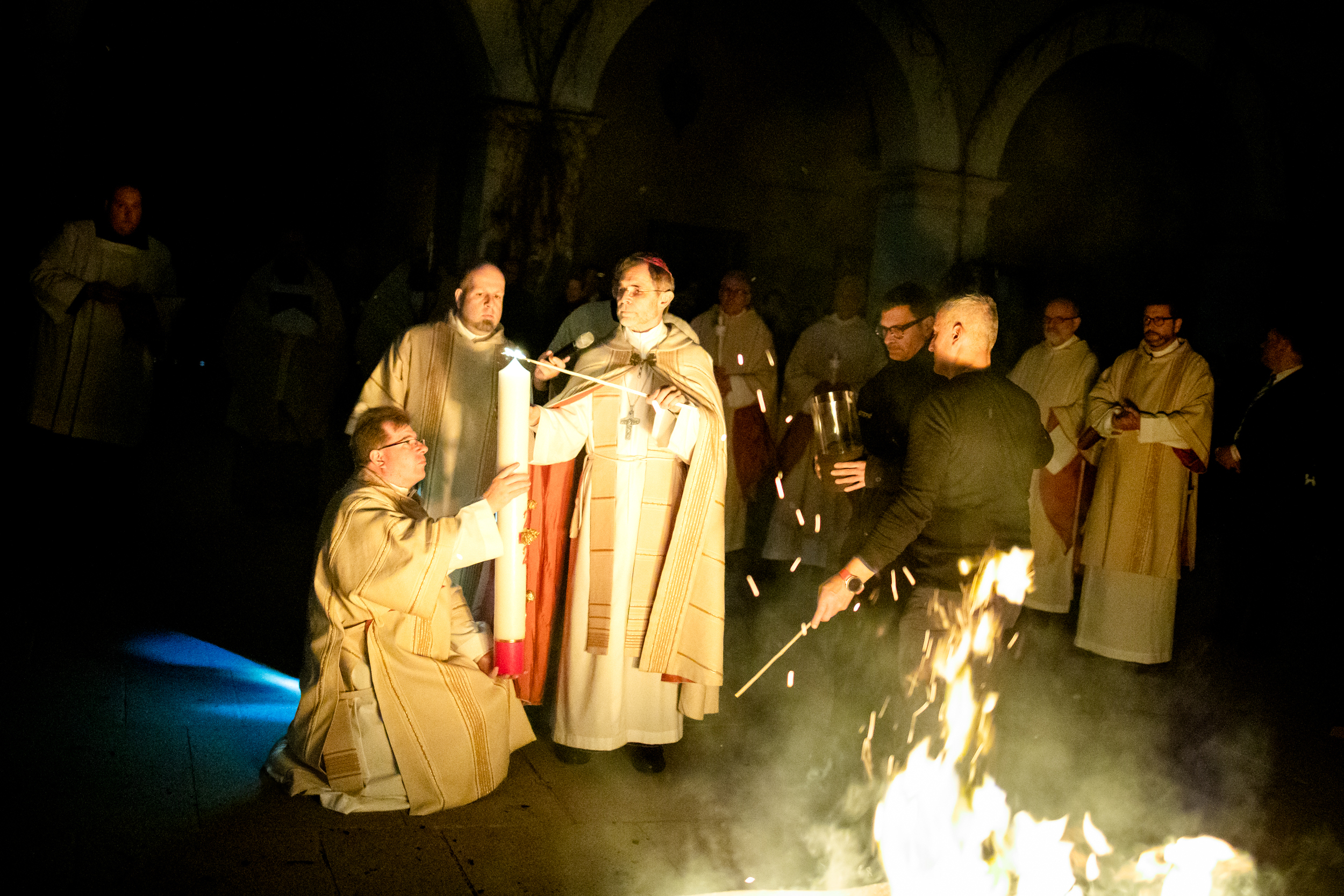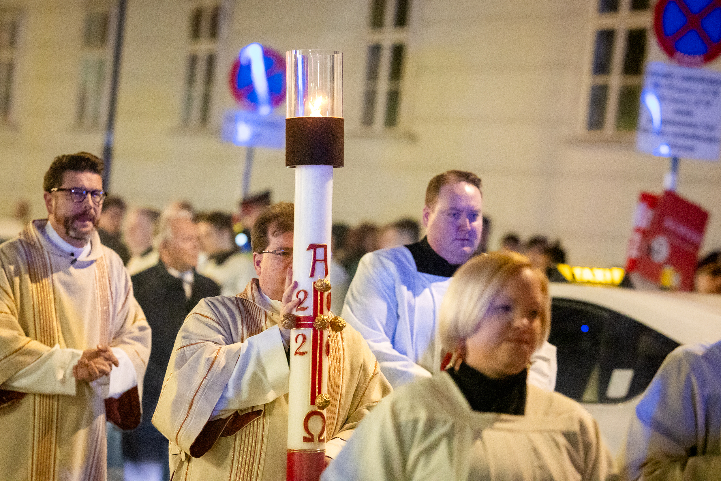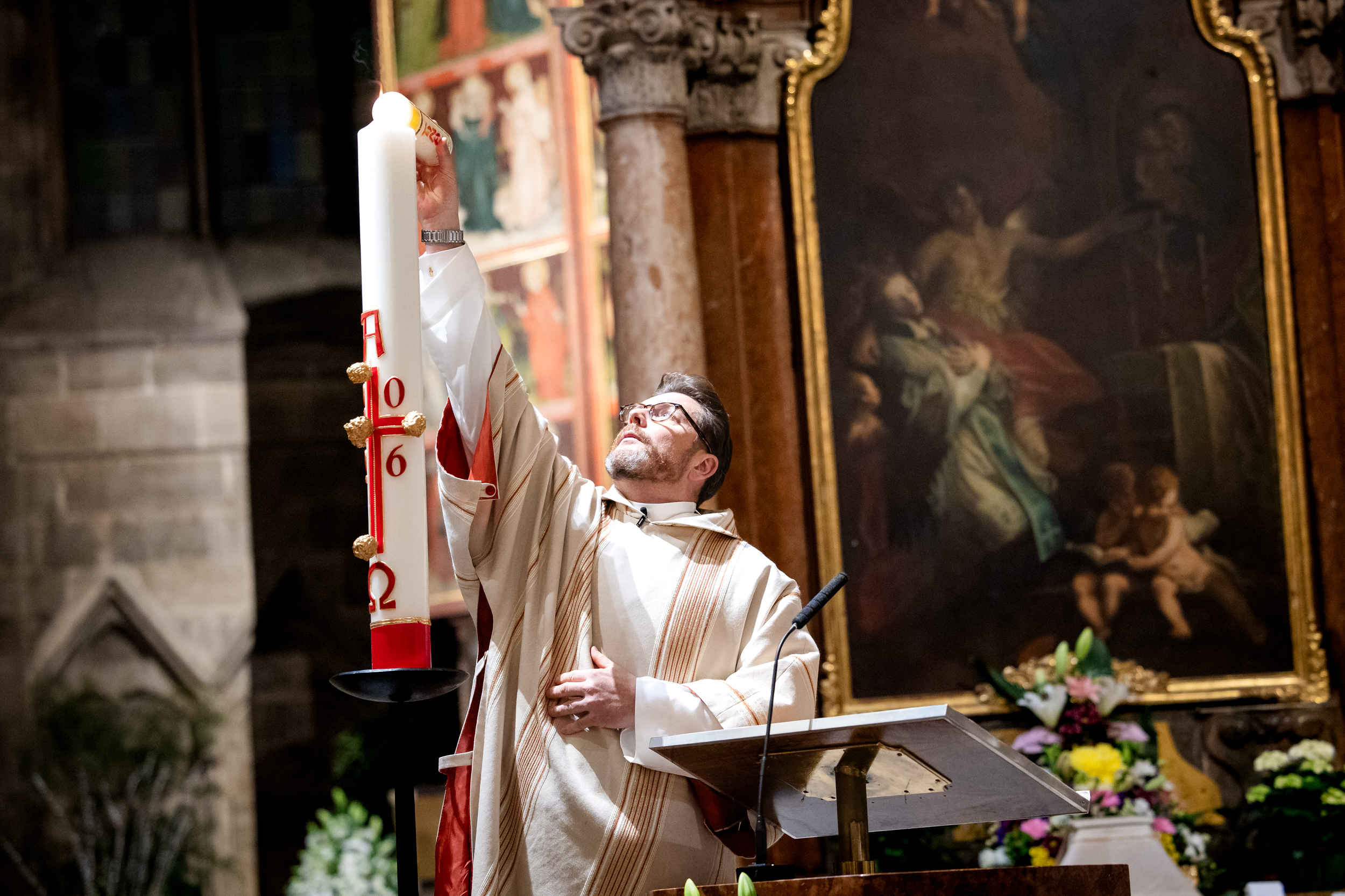 Die Osternacht ist die Feier des Lebens. Ihre Liturgie besteht aus vier Teilen – der Lichtfeier, dem Wortgottesdienst, der Tauffeier und der Eucharistiefeier. Die Lichtfeier beginnt außerhalb des Doms im Hof des Erzbischöflichen Palais. Hier wird die Osterkerze am Osterfeuer entzündet und zum Dom getragen – damit beginnt die Feier der Osternacht. Wir waren mit der Kamera dabei – unter der Leitung unseres Erzbischofs Josef Grünwidl.